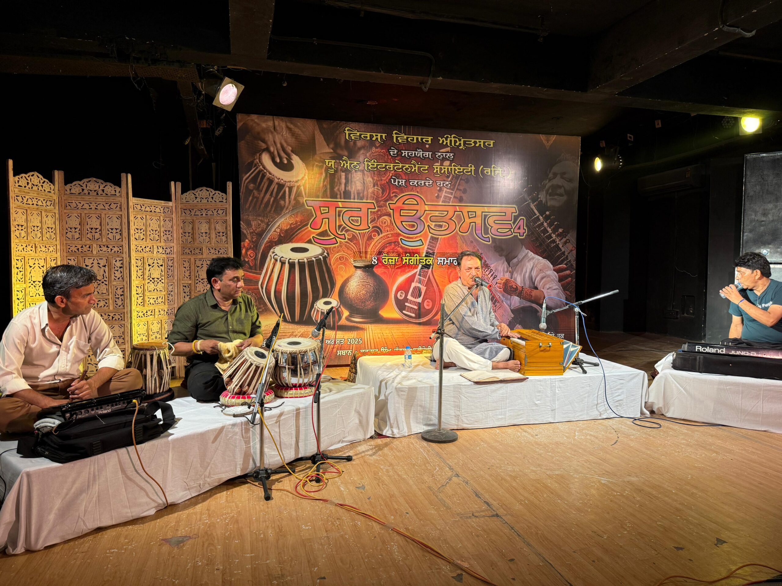 ਅੰਮ੍ਰਿਤਸਰ, 28 ਜੁਲਾਈ ( ਹਰਪਾਲ ਲਾਡਾ ): ਯੂ. ਐਨ. ਇੰਟਰਟੇਨਮੈਂਟ ਸੁਸਾਇਟੀ ਵਲੋਂ ਵਿਰਸਾ ਵਿਹਾਰ ਦੇ ਸਹਿਯੋਗ ਨਾਲ ਪੰਜਾਬੀ ਲੋਕ ਗਾਇਕ ਹਰਿੰਦਰ ਸੋਹਲ ਦੀ ਅਗਵਾਈ ਹੇਠ 27 ਜੁਲਾਈ ਤੋਂ 3 ਅਗਸਤ ਤੱਕ ਵਿਰਸਾ ਵਿਹਾਰ ਦੇ ਕਰਤਾਰ ਸਿੰਘ ਦੁੱਗਲ ਆਡੀਟੋਰੀਅਮ ਵਿਖੇ ਚੌਥਾਂ ‘8 ਦਿਨਾਂ ਸੁਰ ਉਤਸਵ’ ਦੇ ਦੂਜੇ ਦਿਨ ਮੁੱਖ ਮਹਿਮਾਨ ਡਾ. ਮਨਜਿੰਦਰ ਸਿੰਘ (ਮੁੱਖੀ, ਭਾਸ਼ਾ ਵਿਭਾਗ ਜੀ. ਐਨ. ਡੀ. ਯੂ) ਵਜੋ ਸ਼ਾਮਿਲ ਹੋਏ।