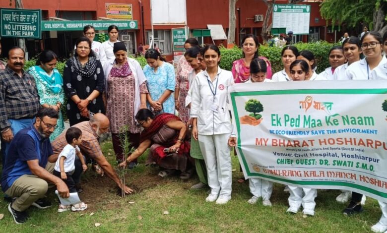 ਹੁਸ਼ਿਆਰਪੁਰ ( ਹਰਪਾਲ ਲਾਡਾ ) : ਇੱਥੇ ਮਾਈ ਭਾਰਤ ਹੁਸ਼ਿਆਰਪੁਰ ਵਲੋਂ ਭਾਰਤ ਸਰਕਾਰ ਦੇ ਪ੍ਰੋਗਰਾਮ ‘‘ਇੱਕ ਰੁੱਖ ਮਾਂ ਦੇ ਨਾਮ“ ਪ੍ਰੋਗਰਾਮ ਸਿਵਲ ਹਸਪਤਾਲ ਹੁਸ਼ਿਆਰਪੁਰ ਚ ਕੀਤਾ ਗਿਆ ਜਿਸ ਵਿੱਚ ਐਸ.ਐਮ.ਓ. ਡਾ. ਸਵਾਤੀ ਸ਼ੀਮਾਰ, ਲਾਇਨ ਕਲੱਬ ਦੇ ਪ੍ਰਧਾਨ ਲਾਇਨ ਵਿਜੇ ਅਰੋੜਾ ਅਤੇ ਅਲਾਇੰਸ ਕਲੱਬ ਦੇ ਨਾੱਰਥ ਮਲਟੀਪਲ ਚੇਅਰਮੈਨ ਐਲੀ ਰਮੇਸ਼ ਕੁਮਾਰ ਵਿਸ਼ੇਸ਼ ਤੌਰ ਤੇ ਪੁੱਜੇ। ਇਸ ਪ੍ਰੋਗਰਾਮ ਦੇ ਸੂਤਰਧਾਰ ਫੈਕੁਲਿਟੀ ਮੈਨੇਜਰ ਸ਼੍ਰੀਮਤੀ ਮੋਨਿਕਾ ਕੰਡਾ ਅਤੇ ਸਟਾਫ ਨਰਸ ਨੀਲਮ ਸ਼ਰਮਾ ਅਤੇ ਹਰਪ੍ਰੀਤ ਕੌਰ ਸਨ।